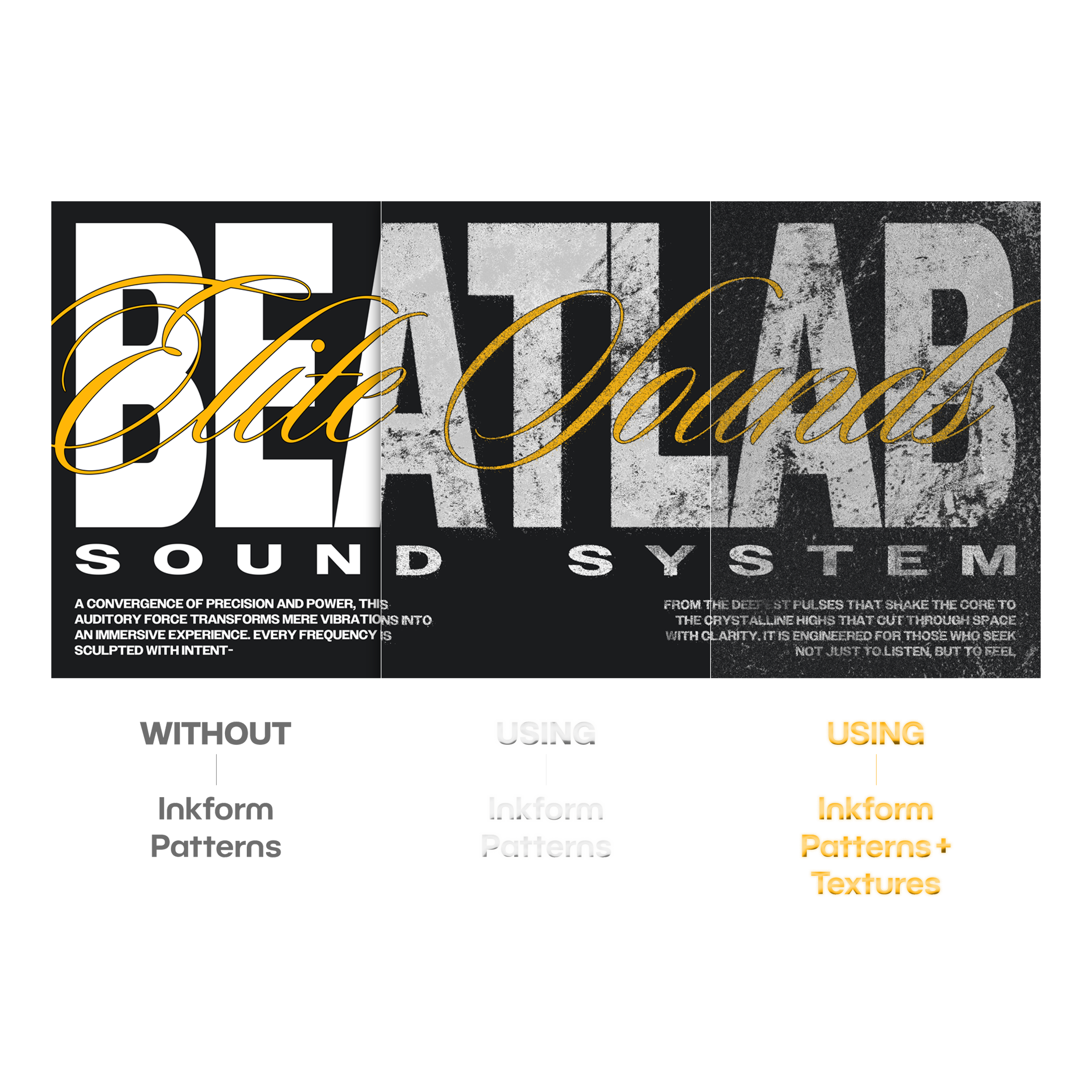 Inkform is a professional texturing system built for graphic designers who want consistent, high quality results. Instead of relying on random overlays, Inkform gives you a structured approach to building surface detail across posters, album covers, branding, and digital artwork.