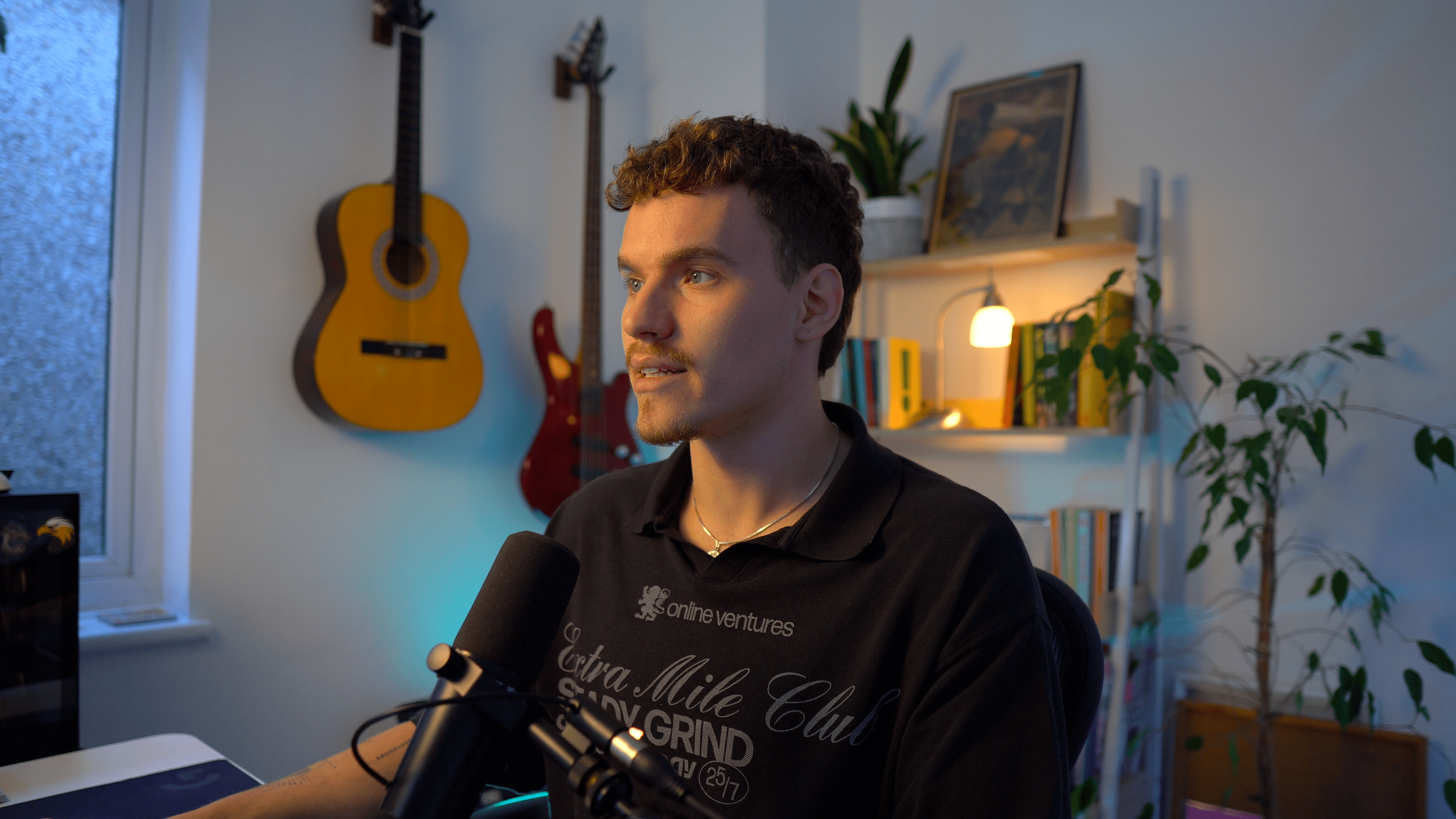 A young man with curly brown hair sits in front of a microphone in a room with guitars hanging on the wall and a bookshelf with plants and framed pictures in the background.