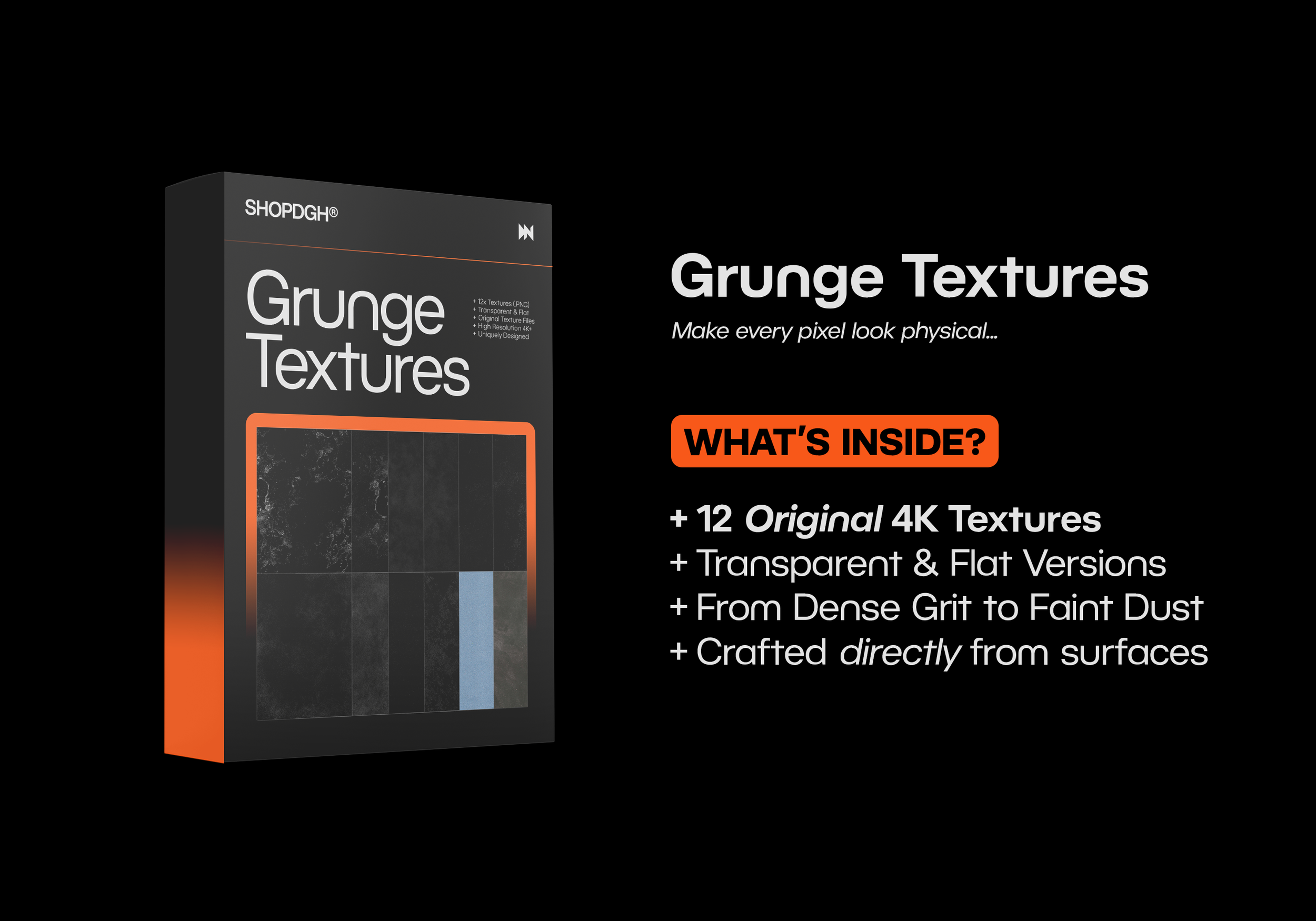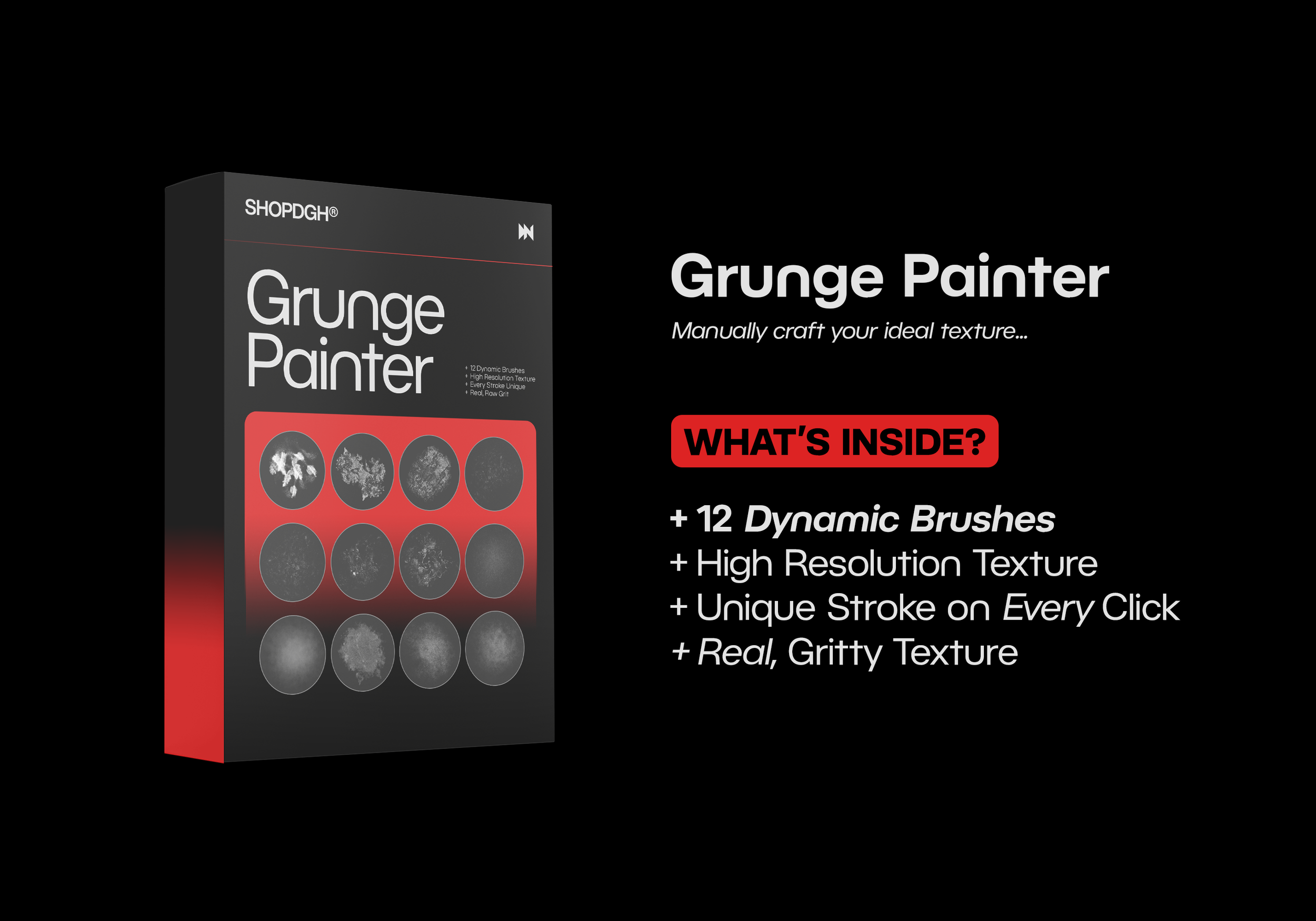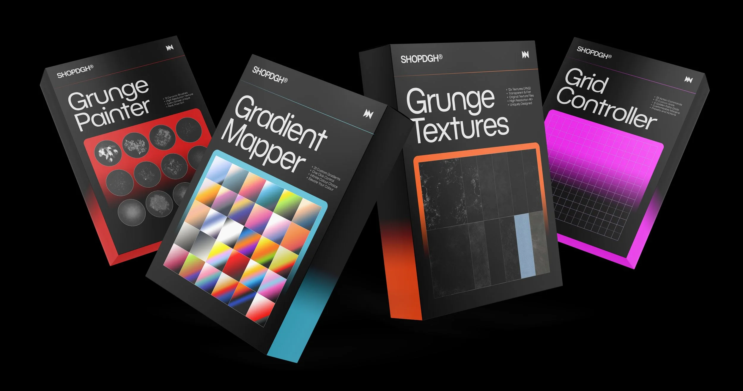 Four art texture packs in black boxes with colorful labels and graphics, including Grunge Painter, Gradient Mapper, Grunge Textures, and Grid Controller, against a black background.